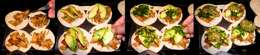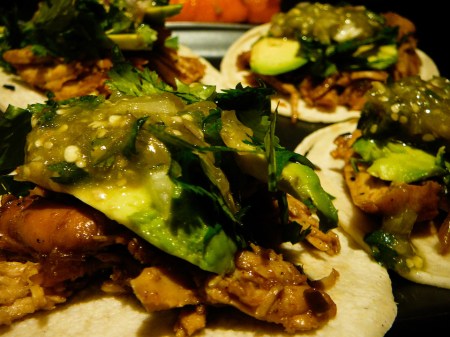 Lay out the desired tortillas and fill with Mamacita Carnitas. Garnish with avocado and cilantro. Finally throw down some salsa. The ultimate salsa to serve with it is a TOMATILLO SALSA of Chicago chef Paul Kahan in DETAILS MAGAZINE. Words can’t describe how epic its is!