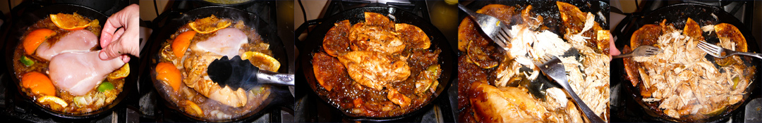 Add the chicken breast or pork butt; I used the chicken because it’s healthier, but traditionally you’d use pork. Life is all about choices so your call. Flip the chicken once the bottom cooks through (approx 3 min). Flip back and forth until all the liquid in the pan becomes a glaze (approx 7 min). Use two forks to shred the meat carnitas style!