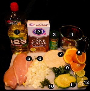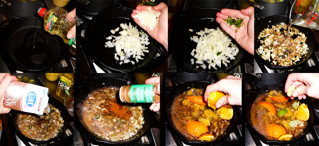 On medium heat, pour oil into the pan and sautÈ the onion and chili until translucent (approx 2 min). Add the water, brown sugar, and cayenne pepper. Squeeze the orange and limejuice in, throwing the peels into the mix.