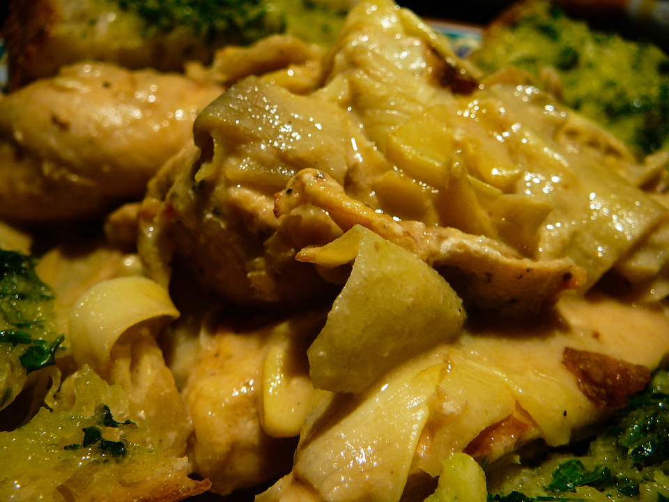 Drain the pan and dry it. Heat up the olive oil in a pan on medium heat. Throw in the artichoke hearts and crack pepper over them if you like while sautéing them (approx 3 min). Add the chicken pieces and pour in 4 ounces of the Alfredo sauce. Cook it all together so the chicken absorbs the cream (approx 4 min).