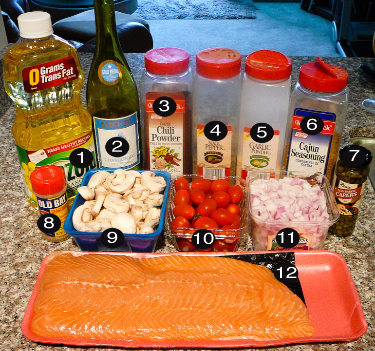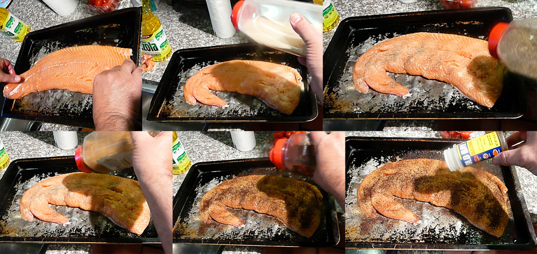 Preheat the oven to broil. Season up the salmon slab on an baking sheet with garlic powder, black pepper, Cajun seasoning and chili powder. Throw the fish in the oven.
