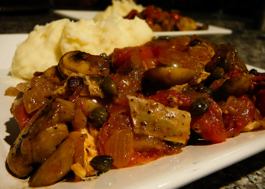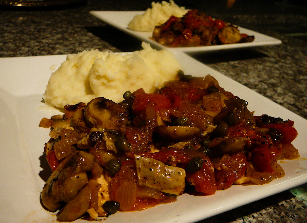 Create the sauce by sautéing the onions and mushrooms on high heat with 1 tbsp of oil with some black pepper (approx 4 min). Add in the tomatoes and sauté them with the white wine until they get soft (approx 4 min). Use the back of a spoon to pop each cherry…tomato. Turn the heat down low and simmer the tomatoes with the capers until the fish is ready.