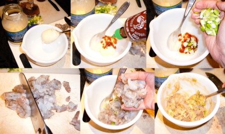 Preheat oven to 350°F/175°C. Mix in a bowl the mayonnaise, Sriracha Hot Chili Sauce, green onions, and shrimp chopped up coarsely.
