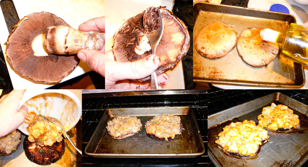 Remove the Portobello stem and scrape away gills with a spoon. Shower the tops with olive oil and scoop the shrimp mixture evenly between the two scooped out Portobello bottoms. Slide into the oven and bake until the shrimp takes on an orangey hue (approx 25 min).