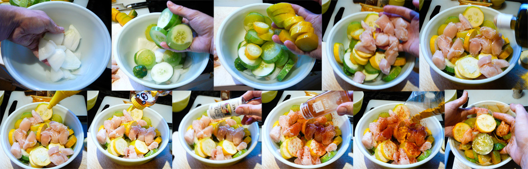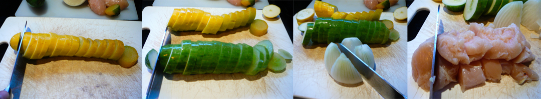 Chop up the squash into bite-sized rounds.  Quarter the onion. Chop the chicken into bite-sized pieces.