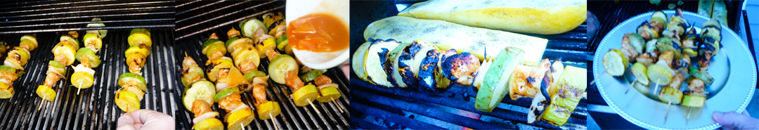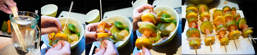 Soak the kebab sticks first and then lance the goods spreading out the squash, chicken and onion.