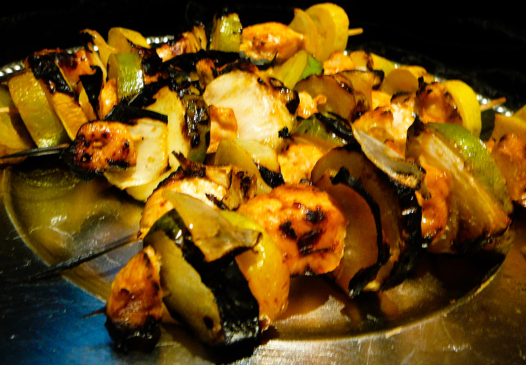 Combine the onion, squash, and chicken in a mixing bowl.  Toss them with olive oil, lemon juice, honey, salt, paprika, and turmeric and let marinate (approx 15 min).  Preheat the grill to medium heat (if using gas).
