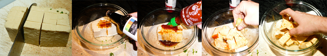 Cut the tofu block into bite-sized pieces. Toss with soy sauce, Sriracha and limejuice and marinate (approx 15 min).
