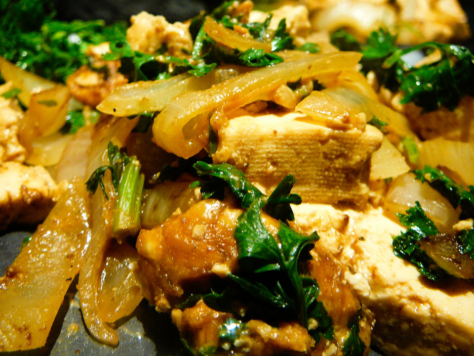 Sauté the garlic and onions in olive oil until they become translucent (approx 3 min). Add the peanut butter and stir until in melts into the onion. Throw in the tofu with the marinade and sauté along with the parsley until the tofu softens (approx 5 min).