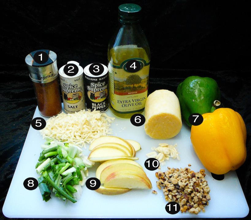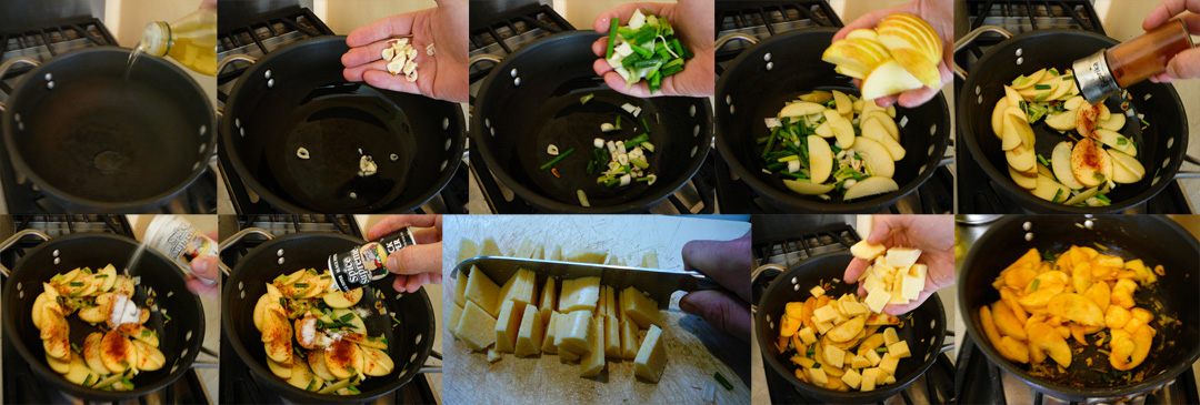 Preheat the oven to 400 degrees F. Sauté the garlic, green onion and apples with olive oil on medium heat (approx 4 min). Spice them with paprika, salt and black pepper. Chop up the polenta into small pieces and sauté them as well (approx 3 min).