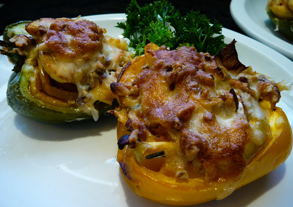 Oil up a small baking pan. Split the bell peppers down the middle and remove the seeds and veins. Stuff them with the polenta/apple mixture all the way to the brim. Sprinkle crushed walnuts and mozzarella over the peppers and bake until they cheese melts (approx 20 min).