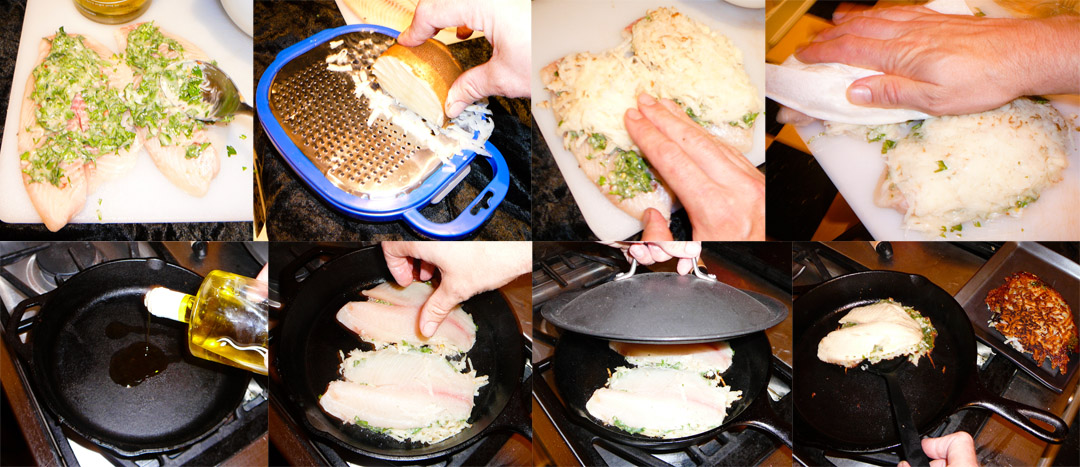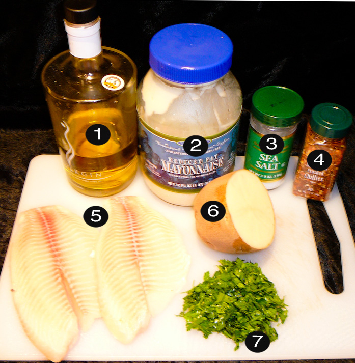 Slather the mayonnaise mixture on top of each filet. Grate the potato down and press that into the fish like a crust, dabbing away excess moisture with a paper towel. Heat up a pan with the olive oil. Press the fish potato side down and cover the pan. Allow the potato to crust and the steam to cook through the fish (approx 5-7 min). Remove from the pan and serve potato side up.