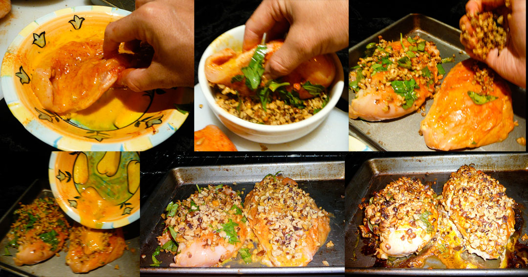 Dip each marinated chicken breast in the whisked egg and then dip both sides into the walnut mixture. Place the chicken in a greased baking pan. Cover the chicken tops with the remaining walnuts. Pour the remaining egg over it and bake until the chicken cooks through and the walnuts form a crust (approx 30 min).