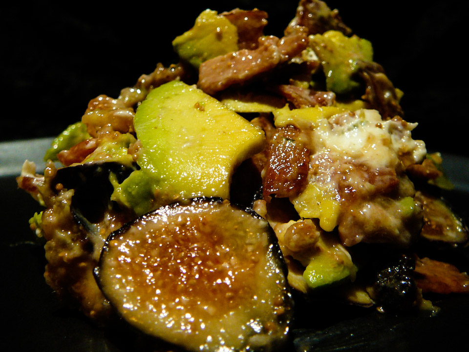 Cut the bacon into niblets and fry them in a pan until crispy. While the bacon sizzles, combine the figs, avocado and Boursin. Finally add the crispy bacon strip and mix it all around like the hokey pokey. You have yourself one ridiculously flavorful side dish!