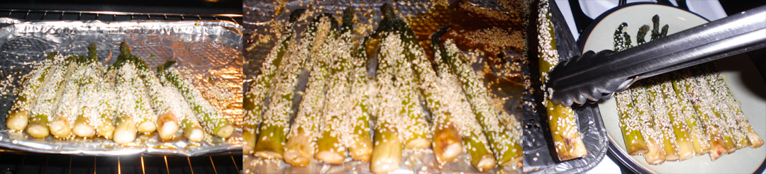 Set the oven to a high broil. Throw the baking sheet with asparagus on the highest rack. Allow the sesame seeds to toast and stick firmly to the asparagus stalks. (Approx 6 minutes) Serve each stalk carefully by grabbing them with tongs to avoid messing up the sesame seeds. Presentation is important.