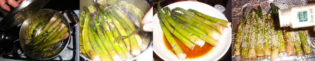 Steam the asparagus until you can easily pierce them with a fork (approx 5 minutes). Toss the steamed asparagus with the sauce. Place the drenched asparagus in a baking pan with room between each stalk. Sprinkle the sesame seeds evenly over the asparagus.