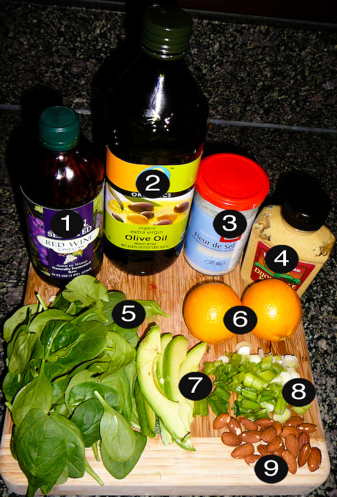 Toss the spinach, blood orange sections, green onions, avocado, almonds, and dressing.