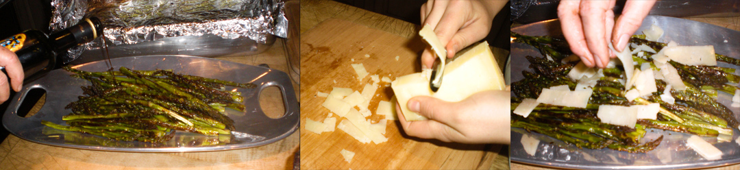 Once the asparagus is the right soft texture, place them on a serving tray and douse with the balsamic vinegar.  Cut up as much manchego cheese as you like and scatter it on top, allowing it to melt a little before serving with a CHICKEN or FISH.
