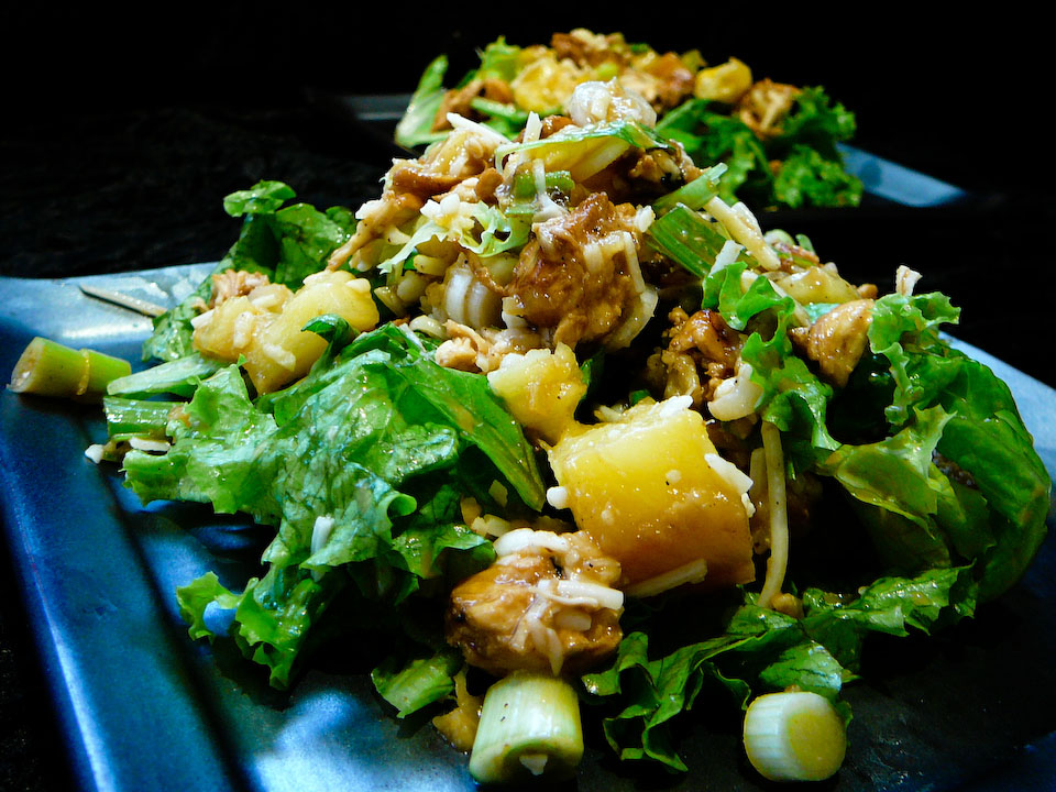 Assemble the lettuce, pineapple, green onions, chopped chicken and toss your salad with the dressing.