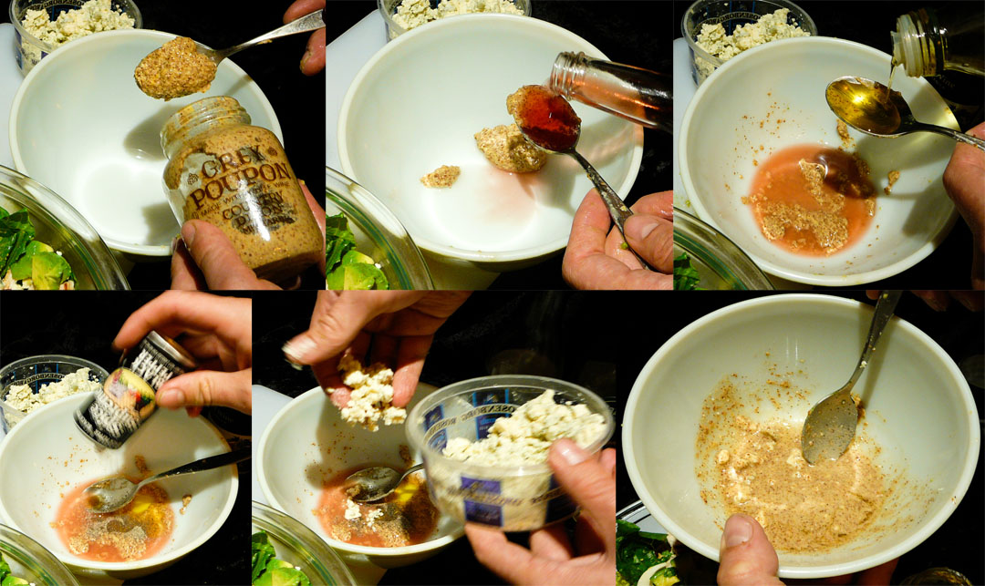 Mix up the dressing by combining the Dijon mustard, ed wine vinegar, olive oil, black pepper and 1 teaspoon of blue cheese. Set aside.