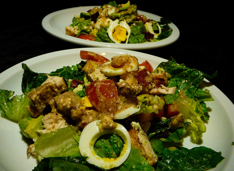 Serve up the plates of salad, tonging up a plateful as is. DO NOT TOSS! You want the layers of Cobb glory to shine like a Tiffany diamond. Scoop in your desired amount of dressing and let the good times roll.