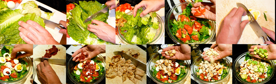 Wash the romaine, cut off the stock, then cut bite-size pieces of lettuce, and line the bottom of a salad bowl. Throw the chopped tomato on top. Slice the egg thinly and spread them out evenly. Chop up the bacon into bits and spread it out too. Chop the chicken breast into bite-sized pieces and scatter those on top. Do the same with a handful of blue cheese and crown it all with avocado.