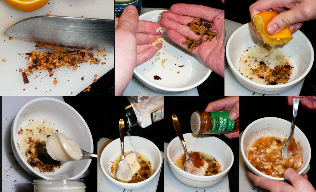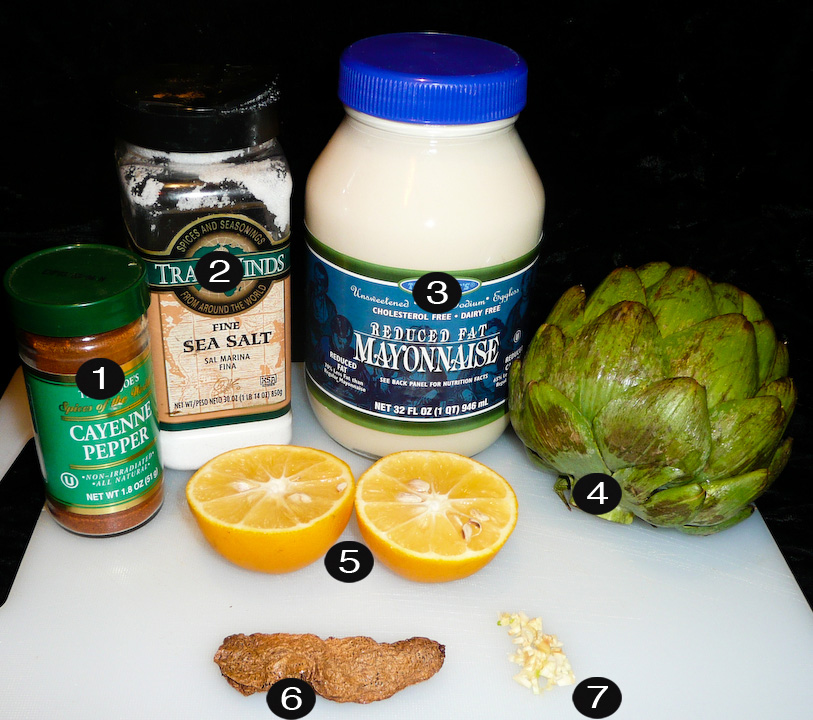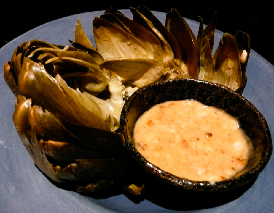 Cut up the dried chipotle chili finely.  Mix it together with garlic, ½ a lemon, mayonnaise, salt, and cayenne pepper.  Refrigerate until the artichoke and your date are ready to rumble.