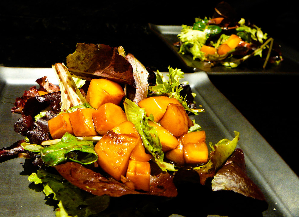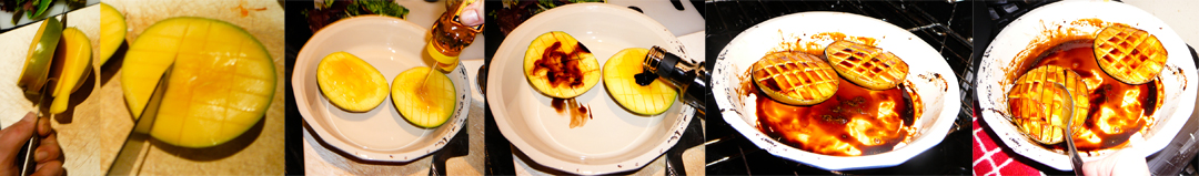 Preheat your oven to 350°F/175°C. Slice the mango on either side of the pit. Cut checkerboard slices into the mango meat, pour in half the honey and balsamic vinegar, and rub it in. Throw the mango halves into a oven safe plate or pan and roast until the meat softens and absorbs the flavor (approx 25 min). Scoop out the mango slices, rubbing them into the sauce.