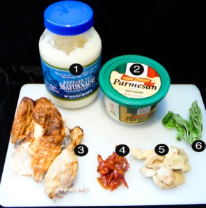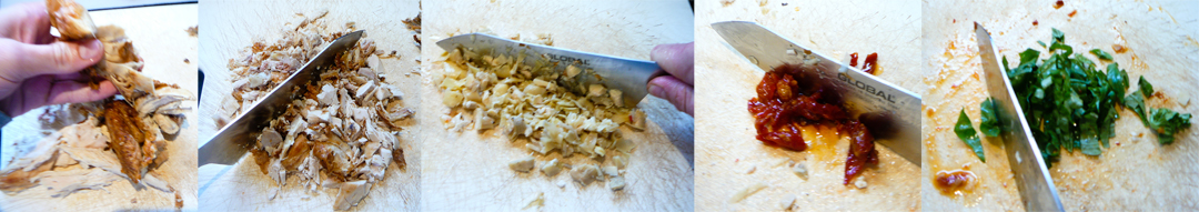 First pull off the chicken from the bones and chopped pseudo-finely. Next chop up the artichoke hearts, sun-dried tomato, and basil.