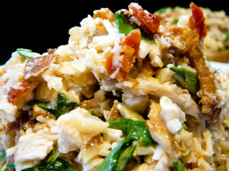 Chicken salad makes most people think of a backyard luncheon on a Sunday afternoon after church. The respectable ladies wear their hats, fan themselves with the hymnal handouts, and nibble on dull chicken salad made with chicken, mayo, and sliced celery. I don’t blame you for dismissing chicken salad as a big old snooze-fest. But what if you substituted Mrs. Anderson’s usual yawn-inducing specialty with the Cook To Bang version turbo-loaded with all things banging? You got yourself a Whitesnake video in the backyard. The ladies will rip holes in their Sunday best, crawl across the foldout tables, and shake their teased hair around as if there’s an oversized fan conveniently blowing. The men, the good reverend included, will headbang and mosh, Jell-O cubes flying everywhere. Careful where you serve this salad! Cook To Bang is no liable for the aftermath.