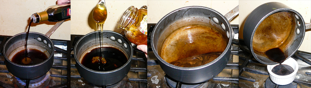 Create the balsamic reduction by pouring the balsamic vinegar and honey in a small pot and bringing to a boil under low heat. Allow ½ the liquid to evaporate and then remove from heat. Pour the reduction in a small bowl and place in the refrigerator so it will cool while you prepare the salad.