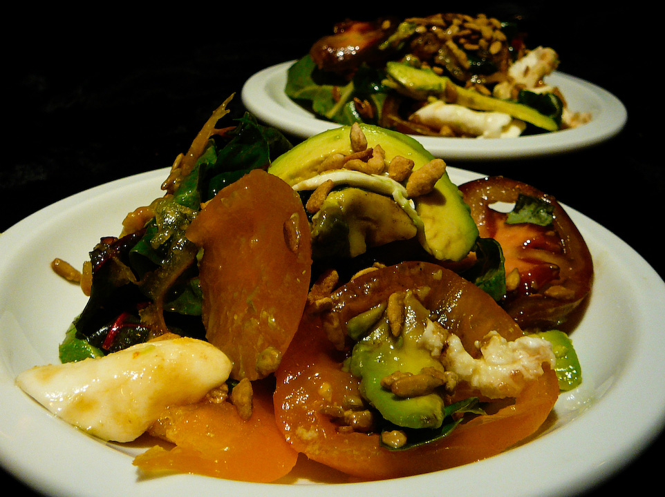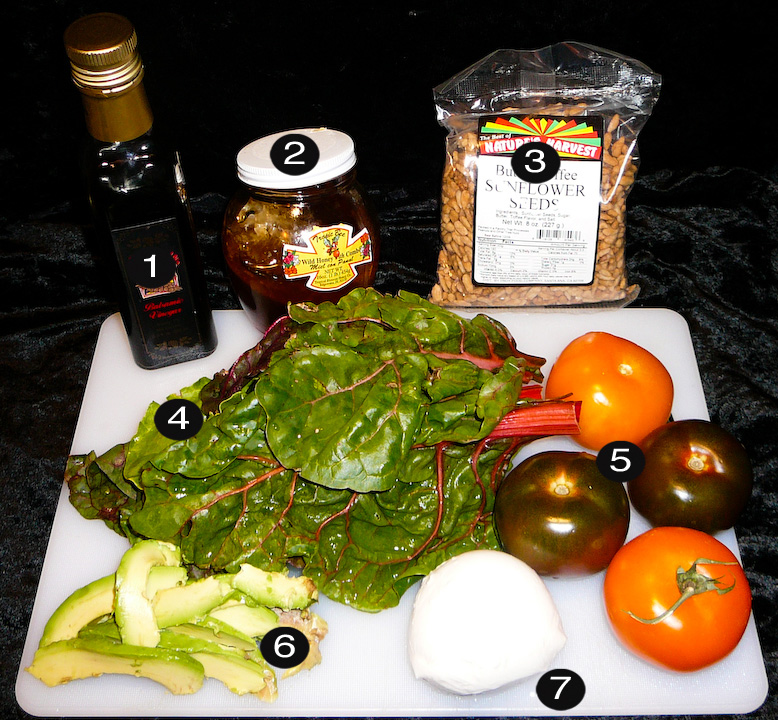 Wash the chard, chop into bite-sized pieces, and then throw in a salad bowl. Wash the tomatoes, cut thin round slices, and toss them in the bowl as well. Toss the avocado slices in too. Cut the buffalo mozzarella into thin rounds and toss those in and crown it all with toasted sunflower seeds.