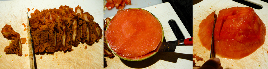 Slice the fried chicken up. Cut the watermelon meat from the rind and cut into bite-sized pieces.