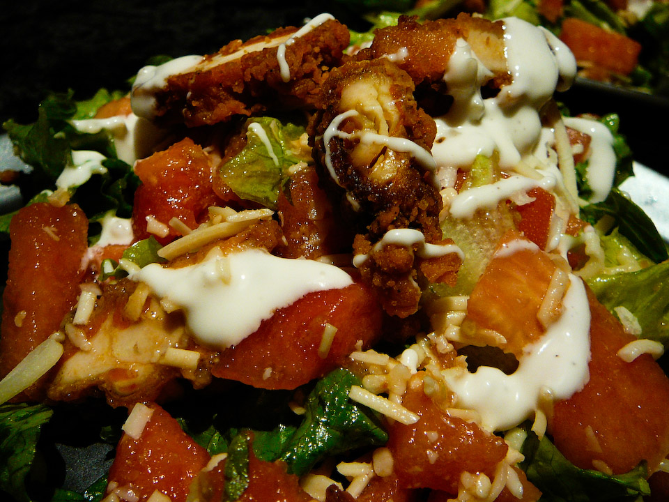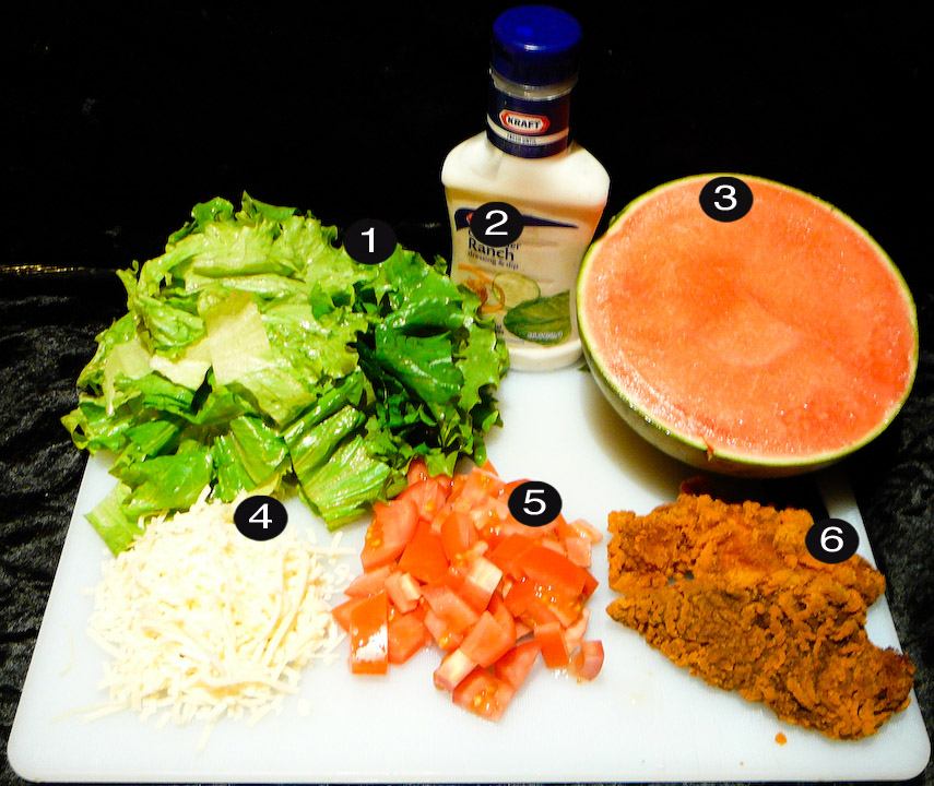 Toss the lettuce, tomato, watermelon, fried chicken and mozzarella cheese. Throw on a plate and add as much ranch dressing as your heart desires.