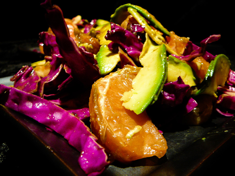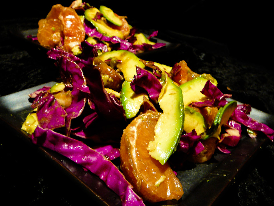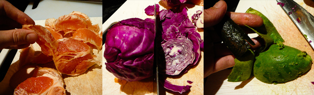 Remove grapefruit peel and separate sections. Chop the red cabbages into strips. Peel the avocado and cut into slices.