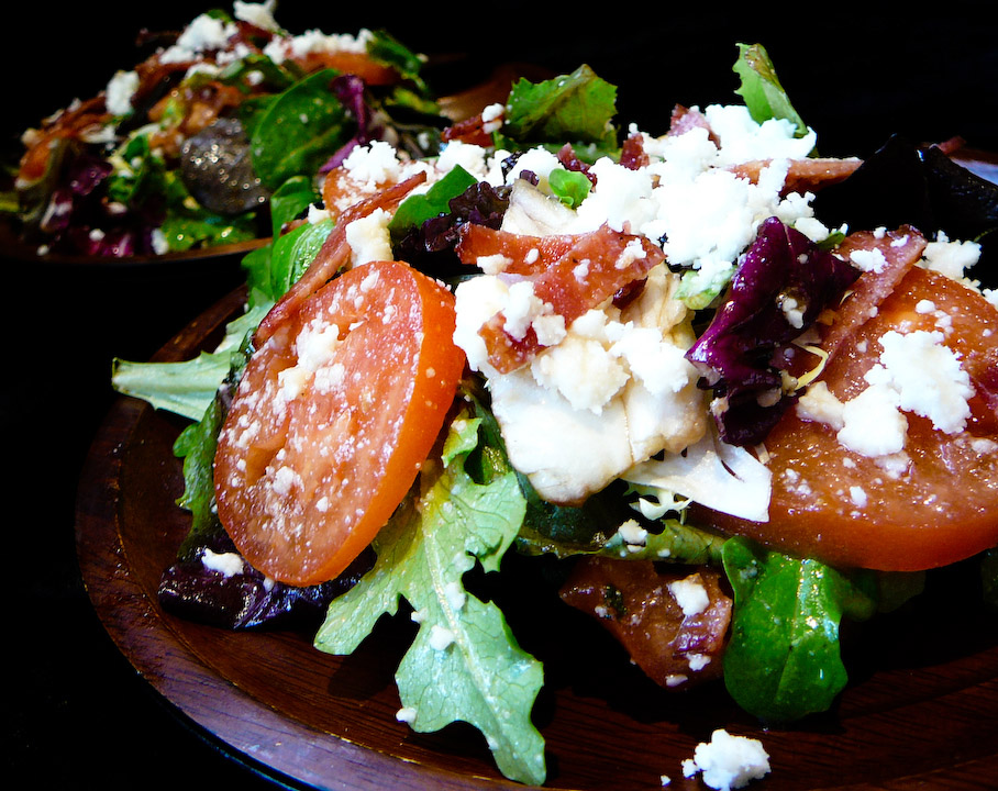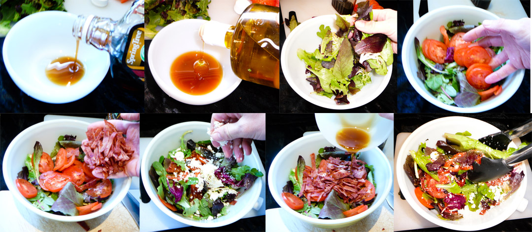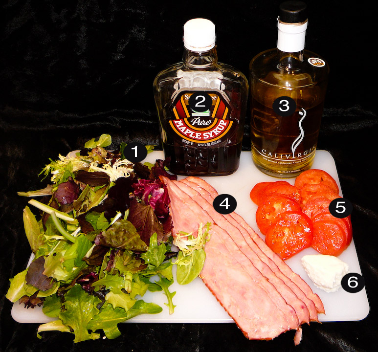 Create the dressing by combining the maple syrup and olive oil. Combine the field greens, tomatoes, bacons strips, crumbled queso fresco, and toss with the dressing.