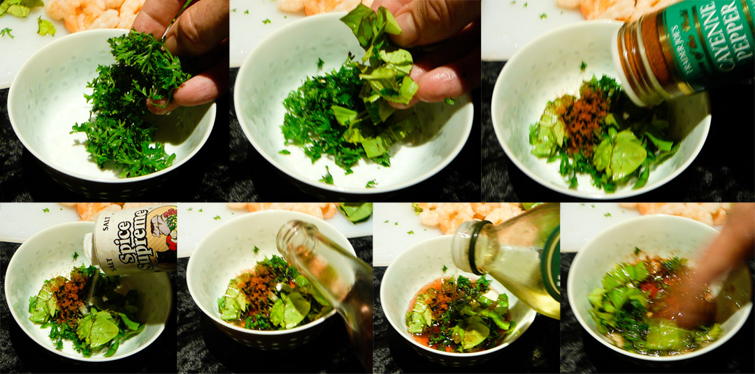 While the asparagus blanches, create the dressing by combining the basil, parsley, cayenne pepper, salt, red wine vinegar and olive oil.