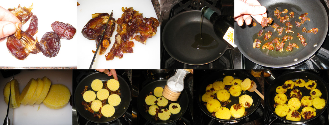Remove the date pits and chop finely. Heat up 1 tbsp olive oil in a pan on medium heat before sautÈing the date bits. Slice the polenta log thinly and add to the pan. Add a dash of salt, pan-fry, and flip (approx 3 min). Add more salt and cook other side through (approx 2 min).
