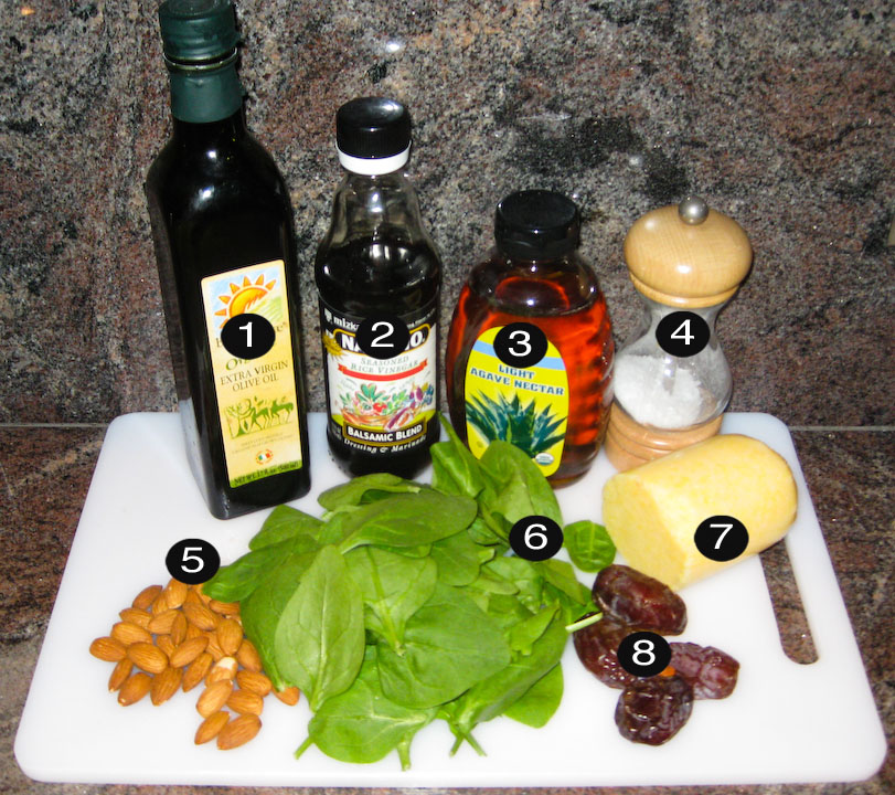 Toss the spinach and soaked almonds with the dressing. Lay out on plates and artfully lay out the cooked polenta rounds, crowning them with sautéed dates.