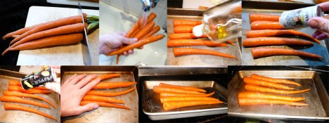 Preheat your oven to 350°F/175°C. Cut the ends off the carrots, wash them and set them in a baking pan. Drizzle with olive oil, salt and pepper. Roast until the carrots soften (approx 30 min).