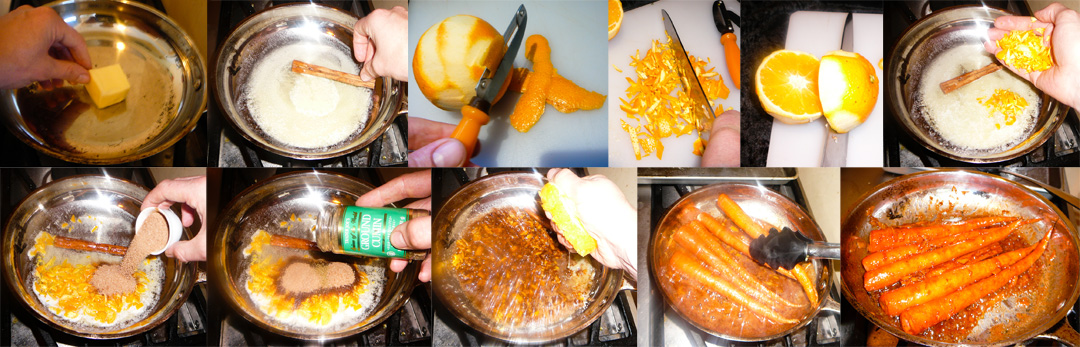 Halfway through the carrot roasting, melt the butter in a pan, adding the cinnamon stick. Peel or zest the orange so you have small slivers. Cut the orange in half. Throw the orange zest, brown sugar, cumin and orange juice in the pan and cook on low until reduce by half (approx 10 min). Add the carrots and stir around in the candied glazy goodness (approx 10 min).