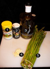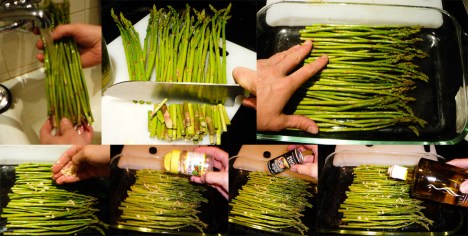 Preheat your oven to 350∞F/175∞C. Wash the asparagus and chop off the tips, and discard. Spread out the asparagus flat in a baking pan. Sprinkle evenly with garlic, salt and pepper, and then drizzle with olive oil.
