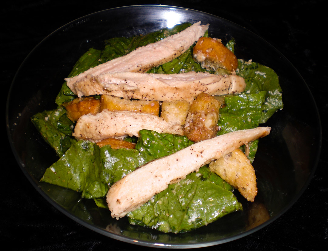 Cut the cooked chicken in to long thin strips. Wash the romaine lettuce then chop into 2 inch long pieces of lettuce. Combine the lettuce, croutons in a bowl, and parmesan, then toss it with the desired amount of dressing (don’t overdo the dressing at first, you can always add more). Finally toss that salad (get your mind out of the gutter). Serve up with the chicken strips over the top, with a little extra parmesan on top. Voila!