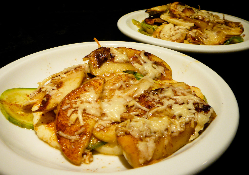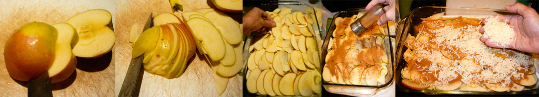 Throw the casserole in the oven and bake until the apples and squash soften, and the cheese melts (approx 30 min).