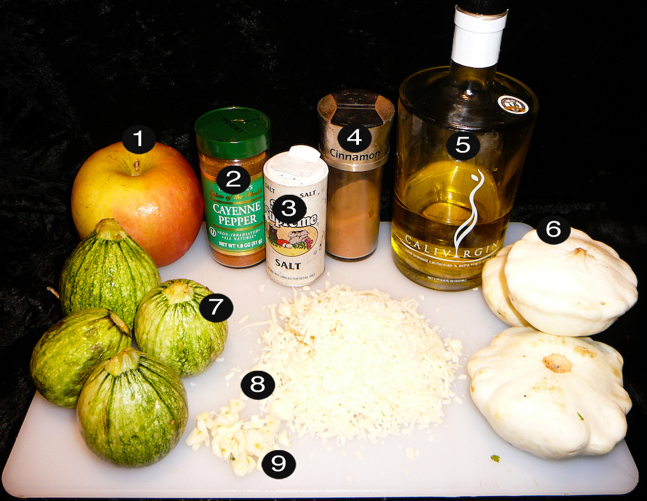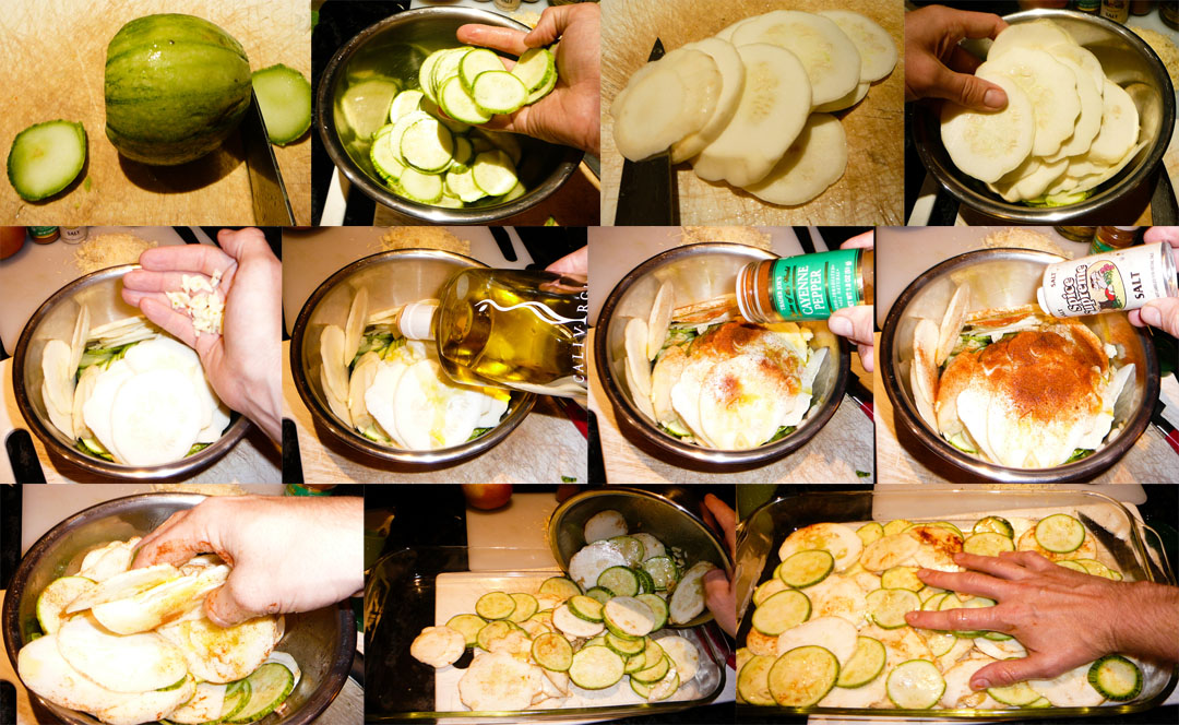 Preheat the oven to 350°F/175°C. Slice the ends off the globe squash and cut into thin rounds. Do the same for the petit pan squash. Toss the squash with the garlic, olive oil, cayenne pepper and salt. Lay them out in a large flat baking pan.