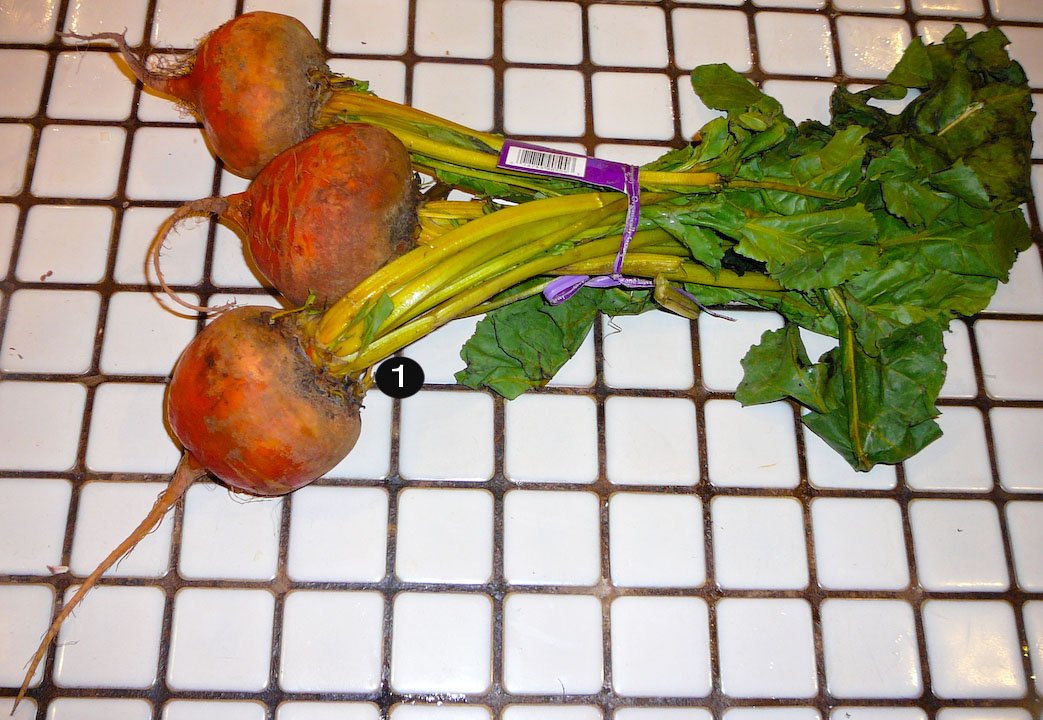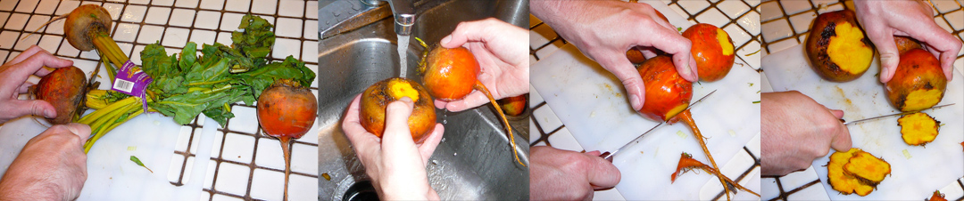Cut the stalks off the beets, wash them thoroughly, and then cut off both ends.