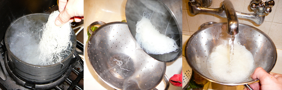 Bring a small pot of water to a boil. Throw the rice noodles in and cook until soft (approx 1 1/2 min). Drain in a colander and rinse with cold water.