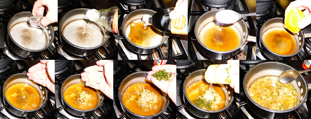 Create the Vietnamese Nuoc Cham sauce. On low heat, warm up the water, rice vinegar, fish sauce, sugar, juice from the orange half, garlic, ginger, chili, and salt. Mix together. Let it cool as you move on to Step 2.