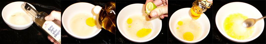 Create the dressing by mixing together the white wine vinegar, olive oil, limejuice, and honey.