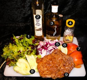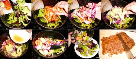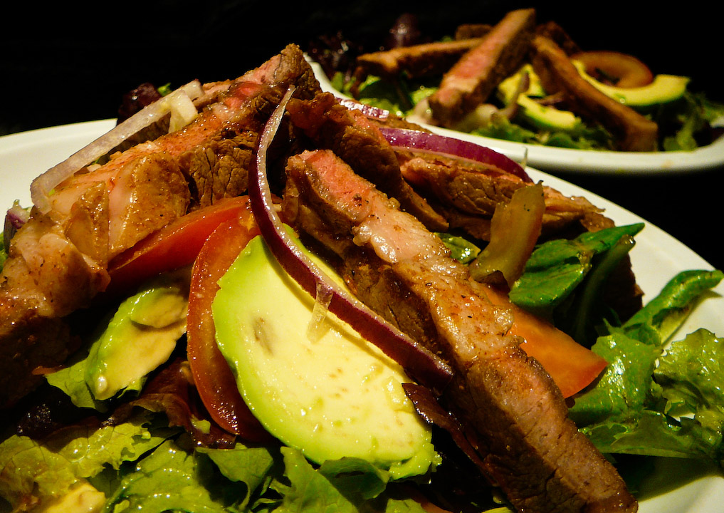 Combine the lettuce, tomato, red onion, and avocado in a mixing bowl, and toss with the dressing. Immediately transfer the salad to plates, slice the streak into thin slices, and artfully arrange over the salad.